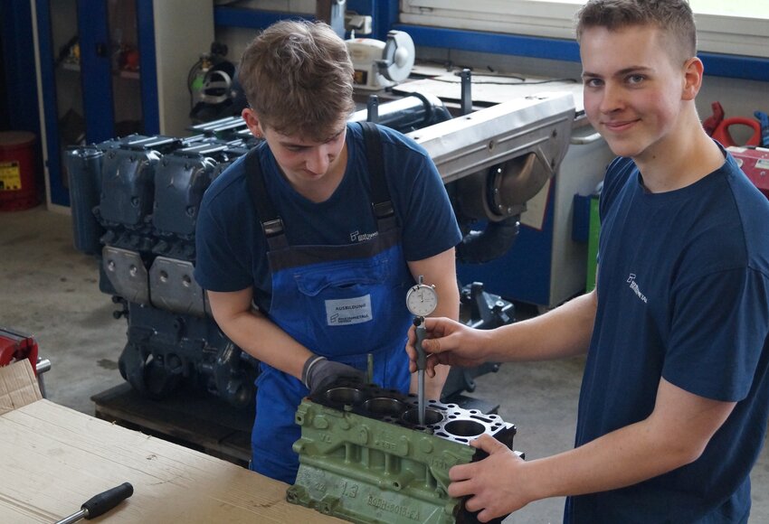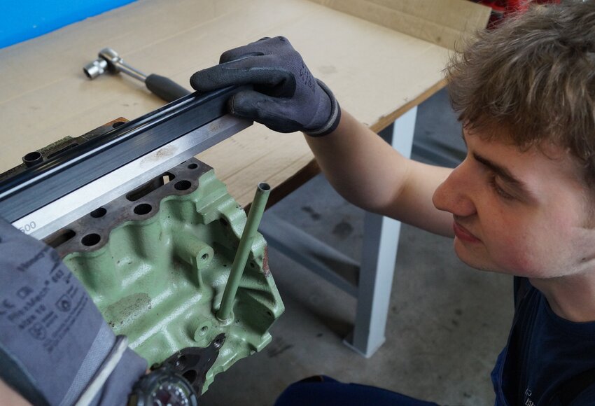 Enno: „Ein Tag in unserer Ausbildungswerkstatt geht von 8 bis 16 Uhr. Zunächst machen wir meistens eine Stunde Theorie zu einem bestimmten Themenbereich, wie beispielsweise Dieselmotoren. Danach geht es an die Praxis. Das bedeutet, wir nehmen uns einen solchen Motor vor, schauen uns den Aufbau an, bauen ihn auseinander und setzen ihn wieder zusammen.“