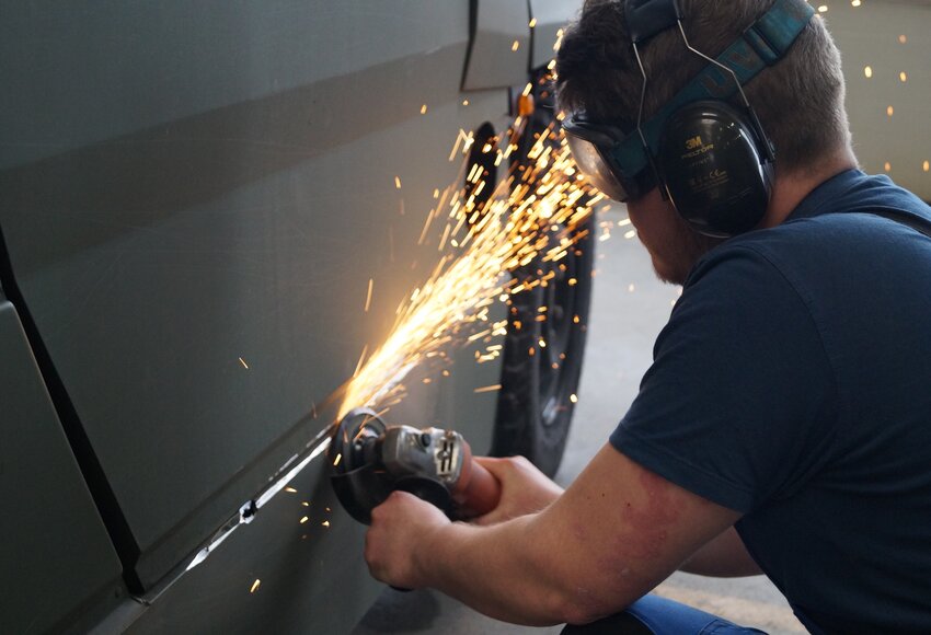 Tim: „Ich habe ein Maschinenbaustudium angefangen und war damit nicht glücklich, es war mir einfach zu theoretisch. Wie die meisten hier habe ich schon zu Hause viel geschraubt und wollte deswegen auch lieber praktisch arbeiten. Rheinmetall habe ich gewählt, weil ich mir schon Gedanken mache, wie es in der Fahrzeugindustrie insgesamt weitergehen wird. Rheinmetall ist ein sicherer Arbeitgeber. Dazu kommt, dass die Arbeit aufgrund der verschiedenen, außergewöhnlichen Fahrzeuge, an die man sonst nie rankommen würde, besonders spannend ist.“