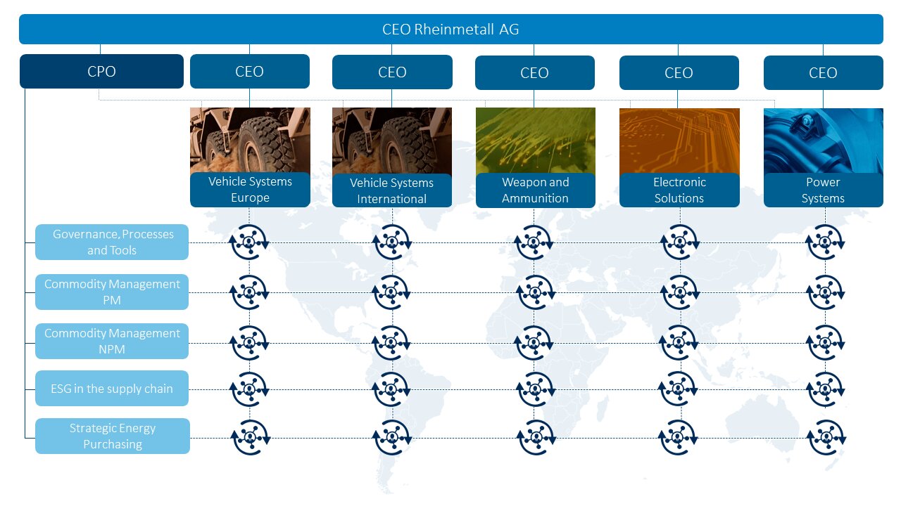 Der Einkauf bei Rheinmetall agiert als übergreifende Matrix über alle Divisionen. In den dezentralen Geschäftseinheiten entstehen unsere Produkte und werden Werte geschaffen. Deswegen ist der Einkauf entsprechend dezentral in den Divisionen verankert und arbeitet dort eng verzahnt mit „dem Business“ zusammen. Durch übergeordnete Steuerung von Warengruppen und Prozessen stärken wir unsere Wettbewerbsfähigkeit. Darüber hinaus stellen wir sicher, dass die Qualität der beschafften Waren und Dienstleistungen eingehalten wird und wir einen Mehrwert für das Unternehmen und unsere Stakeholder liefern. Ebenso koordinieren wir die Erreichung unserer Nachhaltigkeitsziele in der Lieferkette über alle Divisionen hinweg.