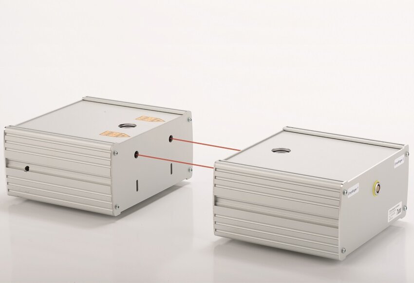 Um bei Crash Tests die exakte Fahrzeuggeschwindigkeit berechnen zu können, wird die Zeitdifferenz zwischen dem Unterbruch der beiden Lichtschranken gemessen. Im einen Gehäuse befinden sich zwei Highspeed Laserlichtschranken, im anderen Gehäuse die passenden Empfänger. Fürs grobe Ausrichten der beiden Gehäuse zueinander wurde eine Dosenlibelle im Deckel integriert, zur Feinausrichtung dienen verschiedenfarbige LEDs in der Gehäusefront. Dank der im Gehäuseboden integrierten Stativaufnahme können die Lichtschranken bei Bedarf auf Dreibeinstativen montiert werden.
