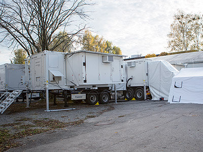 Je nach Konfiguration verfügt das Rettungs-zentrum über Triage, Röntgen, Operationssaal und Intensivstation, um die Patienten nach der Notfall-versorgung für den Transport zur Weiterbehandlung nachhaltig zu stabilisieren. Je zwei bzw. drei LKW mit Anhänger bilden einen funktionsfähigen Einsatzverband.