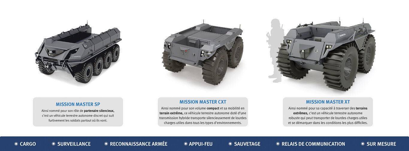 Rheinmetall Mission Master est une famille unique de véhicules terrestres autonomes (VTA) conçus pour accompagner les troupes militaires dans des missions dangereuses, sur des terrains difficiles et dans des conditions météorologiques extrêmes. En plus d’être efficaces pour les opérations de reconnaissance et de surveillance, les plateformes Mission Master peuvent également être dotées de modules permettant la surveillance tactique, l’appui-feu, l’évacuation médicale, la détection CBRN, les relais de communication et tout autre type de mission qui nécessite le soutien d’un VTA.